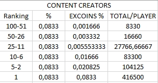 In total, there will be 100 content creators who will receive an amount of 0.5% of all project tokens, as per the table below.
